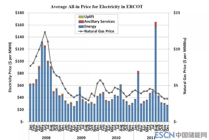 上圖中德州月度批發(fā)市場價格,折線圖是天然氣價格(燃料價格),柱形圖藍(lán)色部分為電能價格,紅色為輔助服務(wù)價格,綠色為為了維持系統(tǒng)安全性而產(chǎn)生的上抬費用。在新市場投運的第一年2011年中,在燃料價格下行的背景下二月和八月的電價飆升了,對此官方解釋是極端天氣導(dǎo)致的用電量歷史高峰(此后價格確實平穩(wěn)了)。事實上,德州市場轉(zhuǎn)型后購電成本是否降低,業(yè)內(nèi)一直有所爭議,但即使有下降,市場模式變化帶來的收益最大不超過2%。