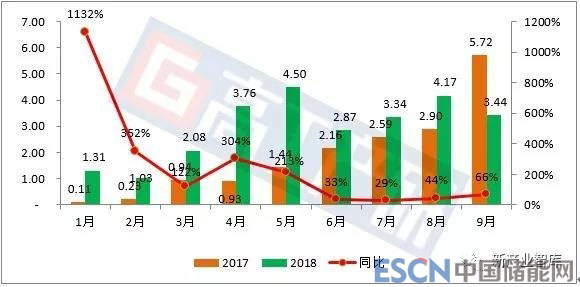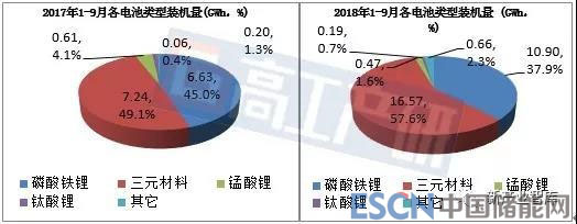 2018年1-9月新能源汽車動力電池裝機量(GWh,%)