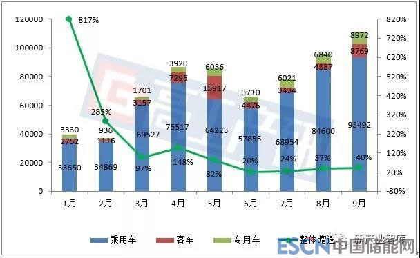 2018年1-9月我國新能源汽車產(chǎn)量分析(輛,%)