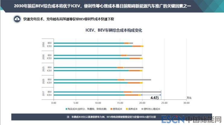 除了制造成本之外,推動純電動汽車成為市場主流的因素還在于購置成本、使用成本、養(yǎng)護成本、便利性成本等綜合成本的降低。從2017年的純電動汽車與燃油汽車的成本對比可以看出,BEV高出ICEV共4.6萬元,這意味著,包含快速充電技術(shù)、充電樁布局等因素推高了BEV的便利性成本,成為目前阻礙新能源汽車推廣的關(guān)鍵因素之一。