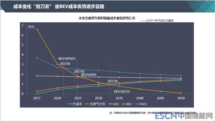傳統(tǒng)汽油車的市場份額不斷下滑的原因之一在于其制造成本不斷增加,比如相對2017年的基準車型來說,2050年其制造成本將上升1.4萬元。