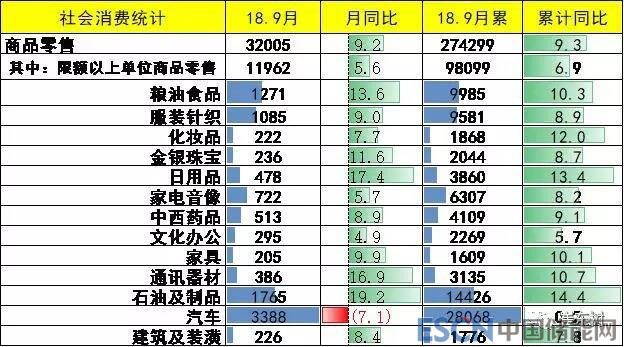 2018年9月份,社會(huì)消費(fèi)品零售總額32005億元,同比名義增長(zhǎng)9.2%。其中,限額以上單位消費(fèi)品零售額12762億元,增長(zhǎng)5.7%。2018年1-9月份,社會(huì)消費(fèi)品零售總額274299億元,同比增長(zhǎng)9.3%。其中,限額以上單位消費(fèi)品零售額104792億元,增長(zhǎng)6.9%。。