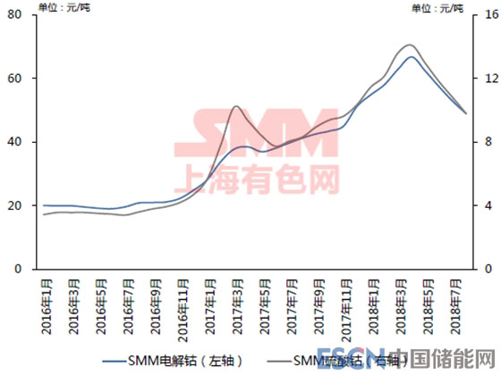 2016年至今SMM電解鈷和硫酸鈷價(jià)格走勢(shì)圖: