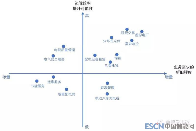 下面我們按照上述的兩個維度,對現(xiàn)有的一些綜合能源服務(wù)業(yè)務(wù)進(jìn)行了定位,這只是一個示意圖,并不代表未來的趨勢和方向,僅供大家參考。