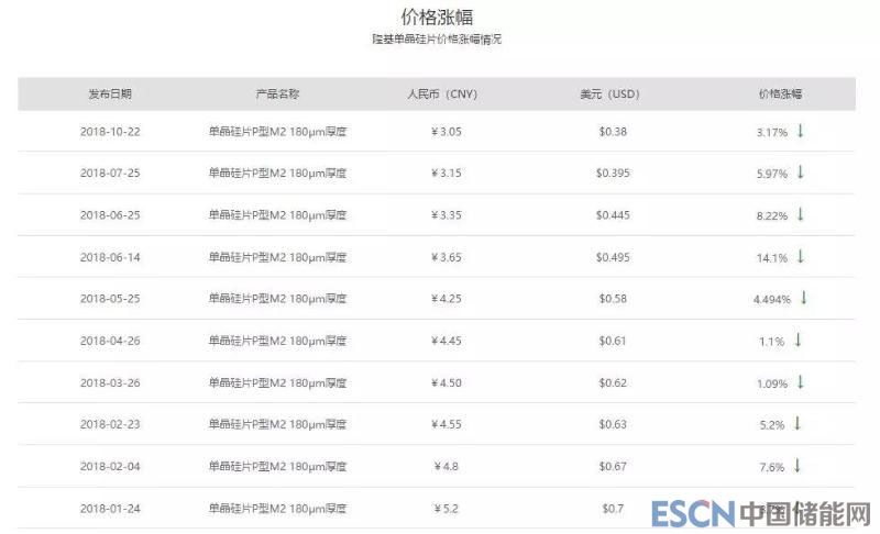 中國(guó)儲(chǔ)能網(wǎng)訊:10月22日上午,單晶龍頭隆基綠能科技股份有限公司發(fā)布了180μm單晶硅片的最新價(jià)格:3.05元/片,比之前降低了0.1元。這是他們今年第9次下調(diào)硅片價(jià)格,比去年年底成交價(jià)(5.4元/片)下降了43.5%.