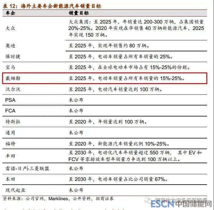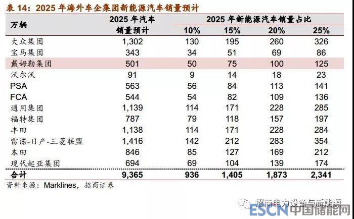 2025年海外車企新能源車當(dāng)年銷量預(yù)計達(dá)1400萬輛以上:2012-2017年,海外12大車企集團(tuán)(不包含特斯拉)所有整車銷量CAGR約2.6%。假設(shè)該復(fù)合增速為2017-2025年的增速,對應(yīng)2025年銷量為9365萬輛。我們分別假設(shè)2025年12大車企集團(tuán)新能源汽車(EV+PHEV)滲透率為10%、15%、20%、25%,分別對應(yīng)936、1405、1873、2341萬輛的當(dāng)年銷量。中性預(yù)測2025年海外12大車企的新能源汽車銷量有望達(dá)到1400-1900萬輛。