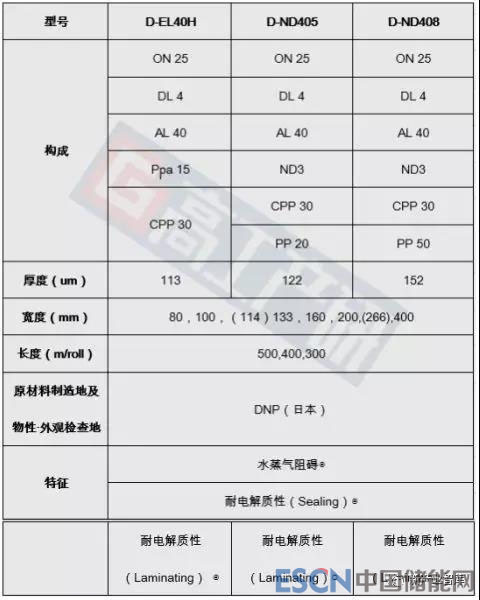 目前市場(chǎng)上DNP鋁塑膜產(chǎn)品規(guī)格有三種,分別為D-EL40H(113 um)、D-ND405(122 um)、D-ND408(152um)三種規(guī)格。以出貨量比例來(lái)看, D-EL40H占比最多達(dá)到80%,D-ND408占14%,D-ND405占6%。