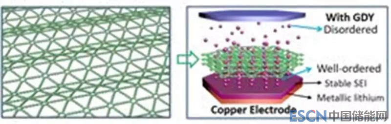 石墨炔結(jié)構(gòu)(左圖)及其在抑制鋰金屬電池中鋰枝晶生長(zhǎng)的應(yīng)用(右圖)