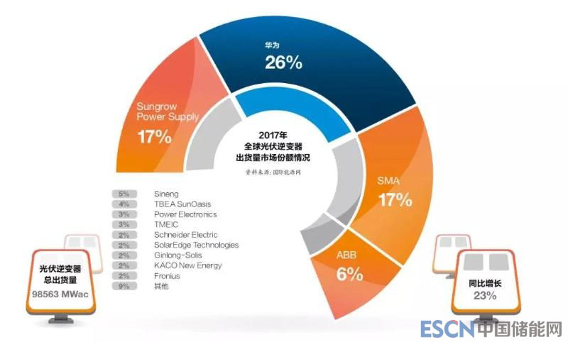 這個榜單發(fā)布的2017全球光伏逆變器出貨量也顯示,華為以26.4%的市場占有率連任全球第一大逆變器供應商。