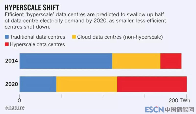 今天,全世界有大約400個超大規(guī)模數(shù)據(jù)中心,其中許多數(shù)據(jù)中心為小型企業(yè)或大學(xué)提供服務(wù),而這些企業(yè)在過去曾擁有自己的服務(wù)器?,F(xiàn)在這些企業(yè)的用電消耗已經(jīng)占據(jù)全球數(shù)據(jù)中心用電量的20%。 IEA表示,到2020年,超大規(guī)模中心將占其中的近一半(參見下圖“超大規(guī)模的轉(zhuǎn)變”)。