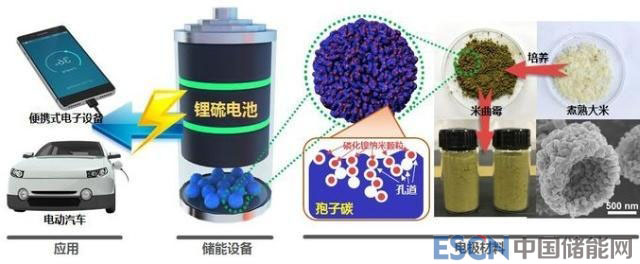 使用煮熟的廢棄大米培養(yǎng)米曲霉霉菌,然后將其改性和碳化,能作為高能量密度鋰硫電池的載硫材料。實(shí)驗(yàn)中,研究團(tuán)隊(duì)利用這種孢子碳特殊的結(jié)構(gòu),并結(jié)合一些特殊的納米造孔技術(shù),制備出了一種全新的霉菌孢子碳/納米磷化鎳復(fù)合材料。