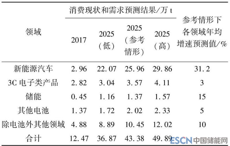 表5 中國2017年鋰消費結(jié)構(gòu)和2025年需求預(yù)測結(jié)果對比