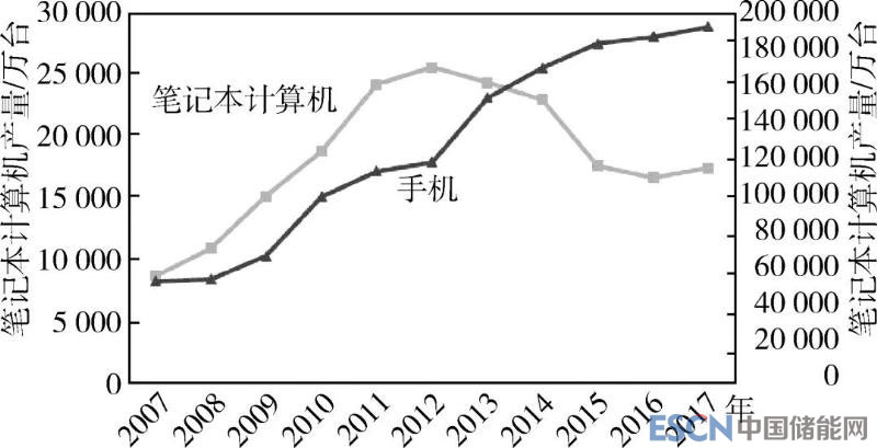圖7 2007~2017年中國手機和筆記本電腦產(chǎn)量變化