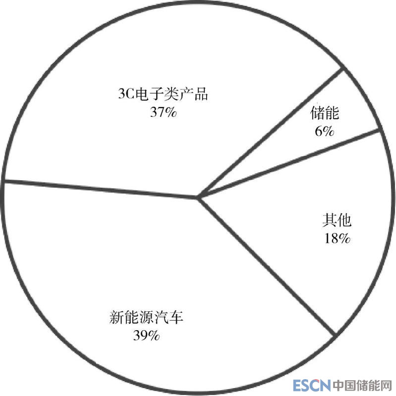 電池領(lǐng)域是目前我國鋰消費第一大部門,主要指鋰離子電池,消費領(lǐng)域可細分為新能源汽車、3C電子類產(chǎn)品、儲能和其他四個領(lǐng)域(圖6),其中新能源汽車和3C電子類產(chǎn)品的占比最高,分別為39%和37%,儲能也有一定消費量,占比約為6%,剩余18%主要應(yīng)用于電動自行車、移動電源、企業(yè)庫存等其他部門。