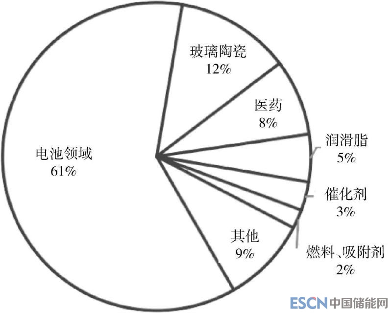 2017年我國鋰資源消費12.47萬t,集中于電池、玻璃陶瓷、醫(yī)藥、潤滑脂等幾個部門,其中電池消費量最大,占比高達61%;其次是玻璃陶瓷,占消費總量的12%;醫(yī)藥、潤滑脂、催化劑、燃料和吸附劑等部門也有一定的消費量,占比均在10%以下(圖5)。