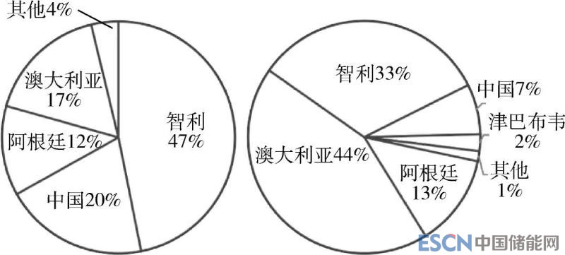 圖3 2017年全球鋰儲量和產(chǎn)量分布
