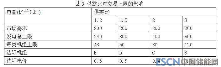 類似的,可以分析得到,供需比為1.5時,市場出清價為D類機組的報價,即0.5元/千瓦時;當供需比為2時,市場出清價為C類機組的報價,即0.4元/千瓦時;當供需比為3時,市場出清價為B類機組的報價,即0.3元/千瓦時。