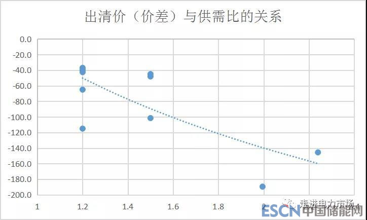 可以看到,2、3月份的出清價降價幅度非常大,達到-145.5厘/千瓦時和-189.5厘/千瓦時,這主要是由于供需比較大:2017年2月的供需比為2.24,3月供需比1.995。后面月份逐步調(diào)低供需比,從4月的1.5,逐步調(diào)整、穩(wěn)定到1.2,價格逐步穩(wěn)定到-40厘/千瓦時左右,每個月的實際出清價會隨整體供需情況、網(wǎng)絡狀況等有一定變化。圖2給出了出清價和供需比的散點圖??梢钥吹?,市場出清價與供需比有很大的關系,通過控制供需比,可以有效的控制市場的出清價。