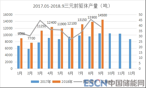 1-9月份三元前驅(qū)體統(tǒng)計(jì)產(chǎn)量10.59萬噸,同比增長36.3%;