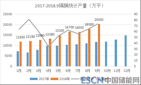 1-9月份隔膜統(tǒng)計(jì)產(chǎn)量13.68億平,同比增長60.1%,產(chǎn)量增速遠(yuǎn)高于行業(yè)平均增速;