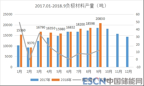 1-9月份負(fù)極材料統(tǒng)計(jì)產(chǎn)量14.83萬噸,同比增長13.6%,需求增長較為穩(wěn)健;