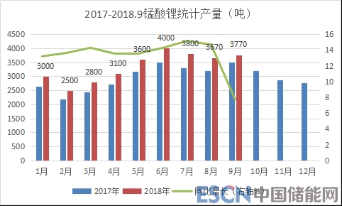 1-9月份錳酸鋰統(tǒng)計(jì)產(chǎn)量3.02萬噸,同比增長13.1%。值得注意的是,由于錳酸鋰需求情況較好,2018年以來新增不少新廠家,但尚未納入統(tǒng)計(jì)之中,故錳酸鋰實(shí)際產(chǎn)量和增速都會高于目前的統(tǒng)計(jì)量。