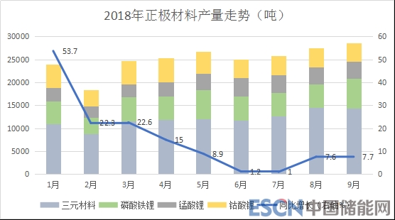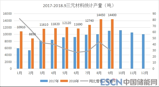 1-9月份三元材料統(tǒng)計(jì)產(chǎn)量10.86萬噸,同比增長40%,現(xiàn)月產(chǎn)量穩(wěn)定在1.4萬噸以上;