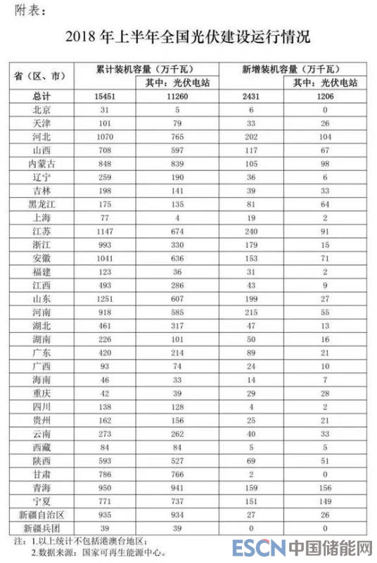 截至2018年6月底,全國光伏發(fā)電裝機(jī)容量達(dá)到15451萬千瓦,其中,光伏電站11260萬千瓦,分布式光伏4190.3萬千瓦。上半年光伏發(fā)電量823.9億千瓦時(shí),同比增長59%;棄光率3.6%,同比下降3.2個(gè)百分點(diǎn)。棄光主要集中在新疆和甘肅,其中,新疆(不含兵團(tuán))棄光電量13.5億千瓦時(shí),棄光率20%,同比下降6.1個(gè)百分點(diǎn);甘肅棄光電量5.9億千瓦時(shí),棄光率11%,同比下降11個(gè)百分點(diǎn)。