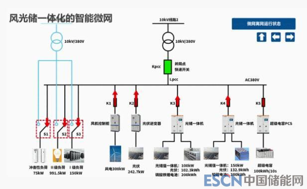 為了確保在外部供電系統(tǒng)失電的情況下,微電網(wǎng)能夠繼續(xù)保證信息中心機房重要負(fù)荷和2棟建筑部分普通負(fù)荷供電的需求,系統(tǒng)還配置有容量為100千瓦×2小時的磷酸鐵鋰電池、150千瓦×2小時的鉛炭電池和100千瓦×10秒的超級電容儲能設(shè)備。三種儲能設(shè)備與學(xué)校的不間斷電源相連,一并接入微網(wǎng)系統(tǒng)。