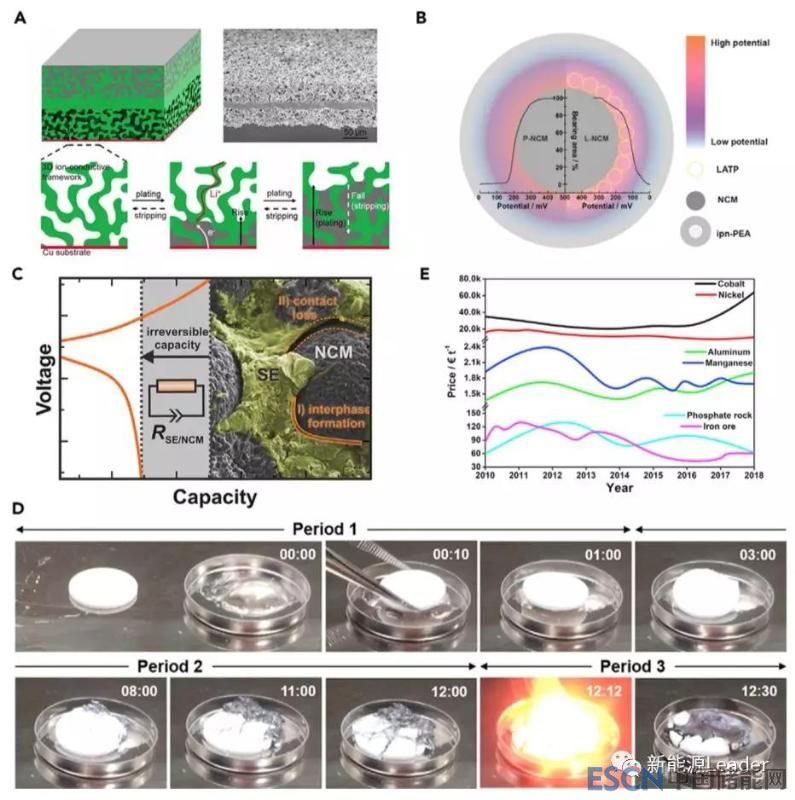 通常我們認(rèn)為固態(tài)電解質(zhì)的安全性是其一大優(yōu)勢,特別是氧化物固態(tài)電解質(zhì)不具有可燃性,因此安全性要遠(yuǎn)遠(yuǎn)好于傳統(tǒng)的碳酸酯類電解液,但是Chung和Kang等人研究卻發(fā)現(xiàn)即便是全固態(tài)電池也存在熱失控的風(fēng)險(xiǎn)。首先他們將Li1.5Al0.5Ge1.5(PO4)3固態(tài)電解質(zhì)(熔點(diǎn)超過1100℃)壓成片,然后放入到熔化的金屬鋰(熔點(diǎn)180℃)之中(如下圖D所示),固態(tài)電解質(zhì)片首先會漂浮在金屬鋰的表面,然后固態(tài)電解質(zhì)片開始發(fā)生破碎和粉化,最后發(fā)生了熱失控。因此全固態(tài)電池固然安全性要好于碳酸酯類電解液,但是全固態(tài)電池仍然存在熱失控的風(fēng)險(xiǎn),在全固態(tài)電池的設(shè)計(jì)和應(yīng)用中也需要充分考慮熱失控的風(fēng)險(xiǎn)。