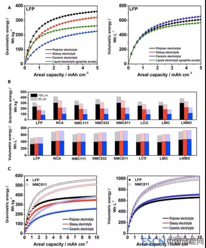 固態(tài)電解質(zhì)的重量和密度也會對全固態(tài)電池的能量密度產(chǎn)生顯著的影響,例如對于Li/玻璃電解質(zhì)/NCM811材料的電池而言,如果固態(tài)電解質(zhì)的厚度從100um降低到30um,其重量能量密度和體積能量密度就能從210Wh/kg、430Wh/L提高到350Wh/kg、720Wh/L(如下圖b所示)。但是需要注意的是,如果采用陶瓷基的固態(tài)電解質(zhì),則無論采用何種正極材料也很難讓鋰離子電池能量密度超過250Wh/kg。