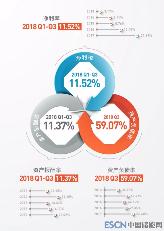 2018年前三季度,隆基實現(xiàn)營業(yè)收入146.71億元,同比增長35.26%;歸屬于母公司的凈利潤16.91億??梢钥闯雎』煞轄I業(yè)收入穩(wěn)步提升,凈利潤一直保持在較好水平,體現(xiàn)了穩(wěn)健的經(jīng)營能力。另外,截至第三季度,隆基總資產升至388.35億;經(jīng)營現(xiàn)金流10.61億,同比增加48.78%;資產負債率59.07%,繼續(xù)保持在行業(yè)合理水平,體現(xiàn)出較強的抗風險能力。