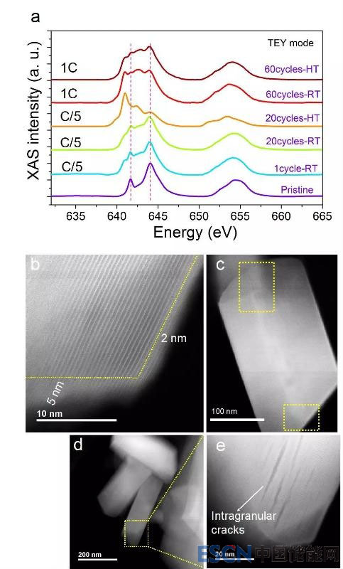(b-e)正極顆粒在60次充-放電循環(huán)后不同放大倍數(shù)的掃描透射電子顯微圖像。