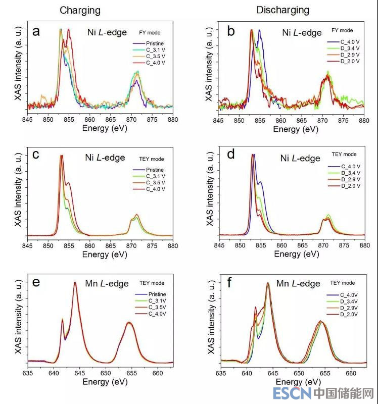 為了進一步的研究正極顆粒表面的化學狀態(tài)的變化,作者通過軟X射線吸收譜(XAS)表征了電極表面各個元素的變化規(guī)律。TEY(Total Electron Yield)模式主要探測顆粒表面10 nm深度,而FY(Fluorescence Yield)模式測試深度可達50 nm。由于鎳元素在電池充電過程主要參與了電荷補償,所以Ni L-edge譜圖在FY模式下表現(xiàn)出逐漸被氧化到高價態(tài)的趨勢。然而Ni L-edge在FY模式所得結果與TEY模式中的譜圖大相徑庭:在各個充放電深度下, 位于表面的Ni價態(tài)均明顯低于體相。而表面鎳元素被還原的過程中,電解液同時會被氧化,這可能是導致電池庫倫效率不高的原因之一。有趣的是,在充電過程中,錳元素在正極顆粒表面始終保持+4價。放電過程中,當電壓低于2.9 V時,錳元素開始被還原。以上實驗所觀察到的現(xiàn)象可能與之前觀察到的表面重構或是過渡金屬從正極溶解并沉積到其表面有關。