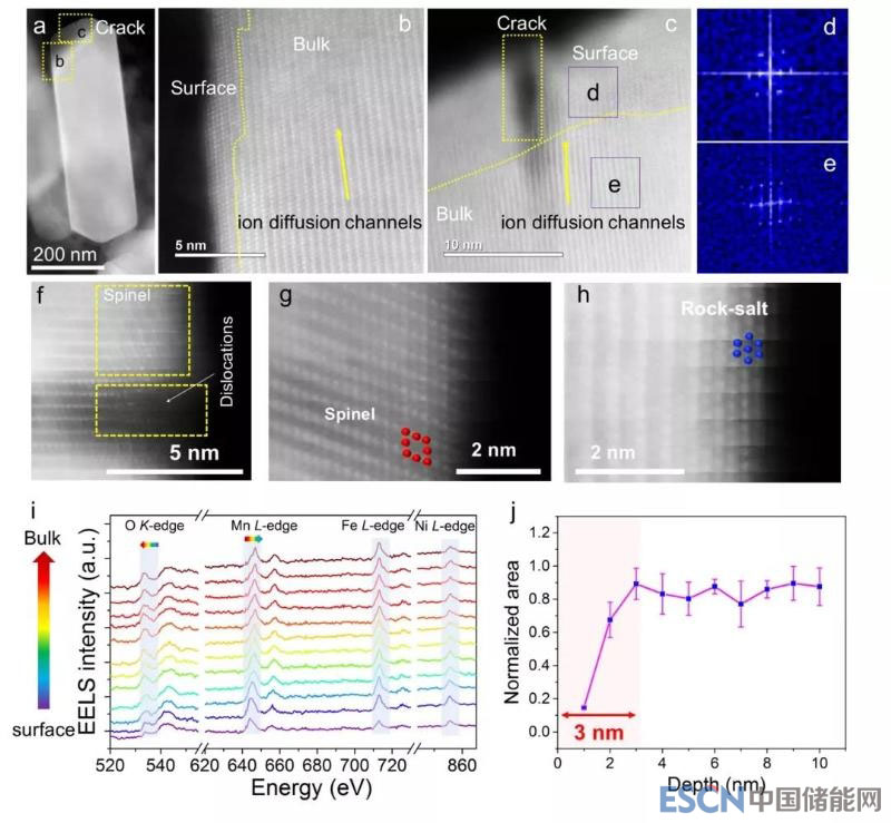進一步的,作者研究了該正極材料在不同溫度和倍率下充-放電循環(huán)后表面化學性質。在室溫下,隨著循環(huán)次數(shù)增多,表面錳的價態(tài)進一步降低,且高倍率充-放電下錳的還原程度弱于低倍率。此外,溫度升高則會加速界面的錳還原和溶解。在錳價態(tài)改變的同時,正極顆粒在循環(huán)60次之后不僅在表面上形成了納米尺度的裂紋,在顆粒內部也產(chǎn)生了裂紋。這些裂紋長度相比只循環(huán)一次后的顆粒表面的裂紋(圖1c)明顯變長。