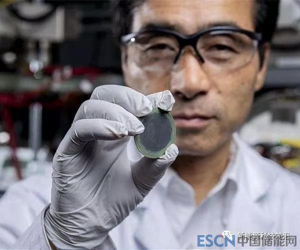 首席研究員Meilin Liu在佐治亞理工學院的實驗室中拿著一個新的、實用的、價格合理的燃料電池單元。圖片來源:Georgia Tech / Christopher Moore
