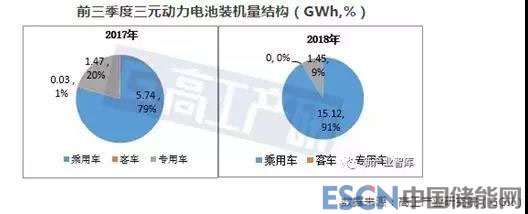 GGII數(shù)據(jù)顯示,在三元動力電池下游終端結(jié)構(gòu)中,2018年前三季度乘用車裝機(jī)量占比91%,較去年同期占比上升12個百分點。