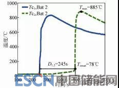熱失控的發(fā)生意味著隔膜的崩潰,同時(shí)發(fā)生大規(guī)模內(nèi)短路,因而對(duì)于兩節(jié)并聯(lián)電池,在熱失控蔓延過程中,電壓下降和熱失控發(fā)生時(shí)間呈現(xiàn)一定的相關(guān)性,見圖3。