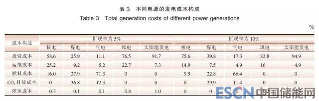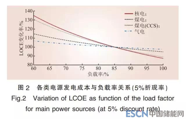 電源的LCOE受其負(fù)載率影響很大,這種影響程度隨著總成本中燃料成本和排放成本的比例變化而變化。最近的IEA/NEA研究報(bào)告分析了各主要電源的總發(fā)電成本構(gòu)成,如表3所示。對(duì)核電而言,由于其成本構(gòu)成主要是投資成本,燃料成本通常不超過(guò)總成本的20%,無(wú)碳排放成本,因此當(dāng)核電參與系統(tǒng)調(diào)峰時(shí),由負(fù)載率下降(年發(fā)電量等比例減少)引起的LCOE變化相較其他電源更大。根據(jù)2010年國(guó)際原子能機(jī)構(gòu)數(shù)據(jù),在折現(xiàn)率5%的情況下,負(fù)載率由90%降至70%時(shí),核電LCOE上升約35%,遠(yuǎn)高于煤電的10%和氣電的7%(如圖2所示)。