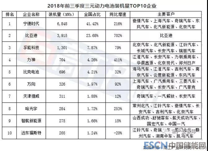 GGII統(tǒng)計(jì),2018年前三季度三元?jiǎng)恿﹄姵匮b機(jī)總量排行榜中,進(jìn)入前十的企業(yè)有寧德時(shí)代、比亞迪、孚能科技、力神、比克電池、萬向、天津捷威、哈光宇、智航新能源、遠(yuǎn)東福斯特。其中,排名前三的企業(yè)合計(jì)市占比達(dá)到72.97%,前十家企業(yè)總計(jì)市占比已經(jīng)達(dá)到89.91%,接近九成。