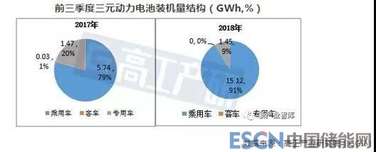 GGII數(shù)據(jù)顯示,在三元?jiǎng)恿﹄姵叵掠谓K端結(jié)構(gòu)中,2018年前三季度乘用車裝機(jī)量占比91%,較去年同期占比上升12個(gè)百分點(diǎn)。
