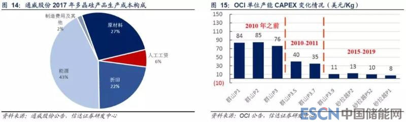 整體來看,OCI 近年來推行降本增效成效顯著,有明確的降本路線。同時(shí),從其各期擴(kuò)產(chǎn)項(xiàng)目單位產(chǎn)能資本性支出來看,2015 年后建設(shè)的新產(chǎn)能單位資本支出明顯低于早期產(chǎn)能,未來馬來西亞擴(kuò)產(chǎn)項(xiàng)目投產(chǎn)其競爭力有望增強(qiáng),2018 年 2 月,隆基股份 與 OCI 簽訂 3 年期采購合同,涉及多晶硅 6.46 萬噸,金額 10.23 億美元,產(chǎn)品品質(zhì)受下游龍頭認(rèn)可。我們認(rèn)為未來 OCI 在 我國市場仍將保持一定競爭力。
