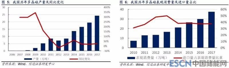 2017 年,我國多晶硅產(chǎn)量為 24.20 萬噸,全球產(chǎn)量為 44.2 萬噸,我國產(chǎn)量占比達(dá)到 55%。從表觀消費(fèi)量看,2017 年我國多 晶硅進(jìn)口量為 14.10 萬噸,出口量為 0.72 萬噸,對應(yīng)表觀消費(fèi)量為 37.58 萬噸。目前我國多晶硅進(jìn)口量占表觀消費(fèi)量的比重 在 37%左右,近年來呈小幅下降趨勢。