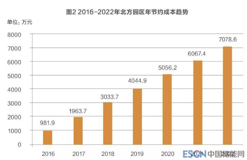 從節(jié)約成本角度看,按目前國網(wǎng)客服中心北方園區(qū)能源系統(tǒng)試運行數(shù)據(jù)計算,北方園區(qū)每年累計節(jié)約電量約1100.2萬千瓦時,年節(jié)約電費共計987.7萬元,預計到2020年將節(jié)約5056.2萬元,2022年節(jié)約7078.6萬元,具體見圖2。
