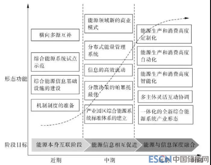 隨著時間推移,產(chǎn)業(yè)園區(qū)綜合能源系統(tǒng)可分為近期、中期和遠期3個發(fā)展階段,從能源本身的互聯(lián)階段,到能源基礎設施和信息基礎設施相互促進,再到能源和信息深度融合。這3個發(fā)展階段是一個同步發(fā)展、相互滲透和逐級遞進的過程。