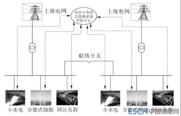 綜上所述,在建設場地有限的產(chǎn)業(yè)園區(qū)可結合當?shù)刎S富的水電資源優(yōu)勢以及小水電和風電的天然互補特征,發(fā)展小水電+分散式風電多能互補綜合能源系統(tǒng)的建設形式,從而最大限度的利用當?shù)厍鍧嵞茉?,減輕間歇性可再生能源發(fā)電并網(wǎng)給配電網(wǎng)絡帶來的沖擊。風水多能互補綜合能源系統(tǒng)形態(tài)示意圖如圖2所示。此外,以小水電為基礎,還可形成水光多能互補、風水光多能互補等典型綜合能源系統(tǒng)。