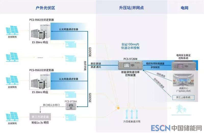 南瑞繼保針對現(xiàn)有新能源大規(guī)模接入電網(wǎng)對光伏電站參與電網(wǎng)暫態(tài)穩(wěn)定調(diào)節(jié)的需要,提出并研制了由新能源快速功率控制裝置、光伏逆變器和快速通信接口裝置(選配)構(gòu)成的PCS光伏電站快速功率控制系統(tǒng)。該系統(tǒng)實現(xiàn)了全站100ms內(nèi)的快速功率響應(yīng),支持了穩(wěn)控系統(tǒng)對光伏電站的“以調(diào)代切”和“升降雙向”控制,使光伏電站具備廠站級百毫秒級快速調(diào)頻、調(diào)壓功能。該系統(tǒng)提高了電網(wǎng)運行的靈活性、可靠性與經(jīng)濟性,大大提高了新能源消納能力。