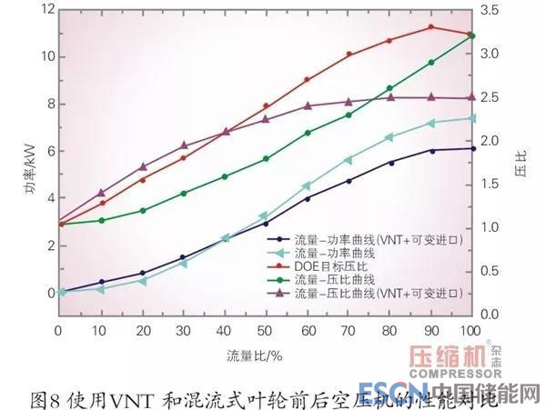 混流式空壓機葉輪和可變渦輪進口導(dǎo)葉(VNT)是改善空氣供應(yīng)系統(tǒng)的流量/壓比特性和功率特性的有效方式,如圖8所示。