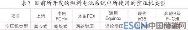 離心式壓縮機在密度、效率、噪聲等方面具有最好的綜合效果,被認為是最有前途的空氣增壓方式之一。表 2為目前所開發(fā)的燃料電池系統(tǒng)中所使用的空壓機類型。