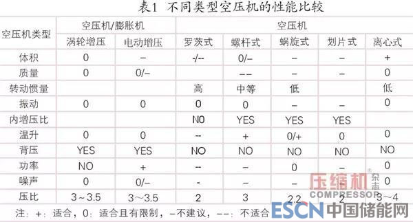 通過比較可以看出渦旋式、螺桿式和離心式空壓機的綜合性能較好。但渦旋式和螺桿式空壓機的葉片間存在相互摩擦,噪聲和質(zhì)量較大,且難以與渦輪匹配工作,無法回收排氣能量,目前只有通過渦輪與離心式壓縮機匹配來實現(xiàn)。